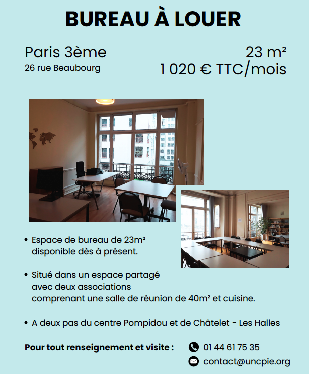 Nos bureaux sont en plein coeur de Paris rue Beaubourg (près métro chatelet-les halles, rambuteau). Nous louons à un prix défiant toute concurrence un grand bureau qui peut accueillir 4 à 6 postes de travail et avec un accès partagé à une grande salle de réunion pouvant accueillir jusqu'à 20 personnes, et accès à une cuisine pour café/déjeuner. Venez visiter ! contact mail et téléphone dans l'image jointe. A bientôt.